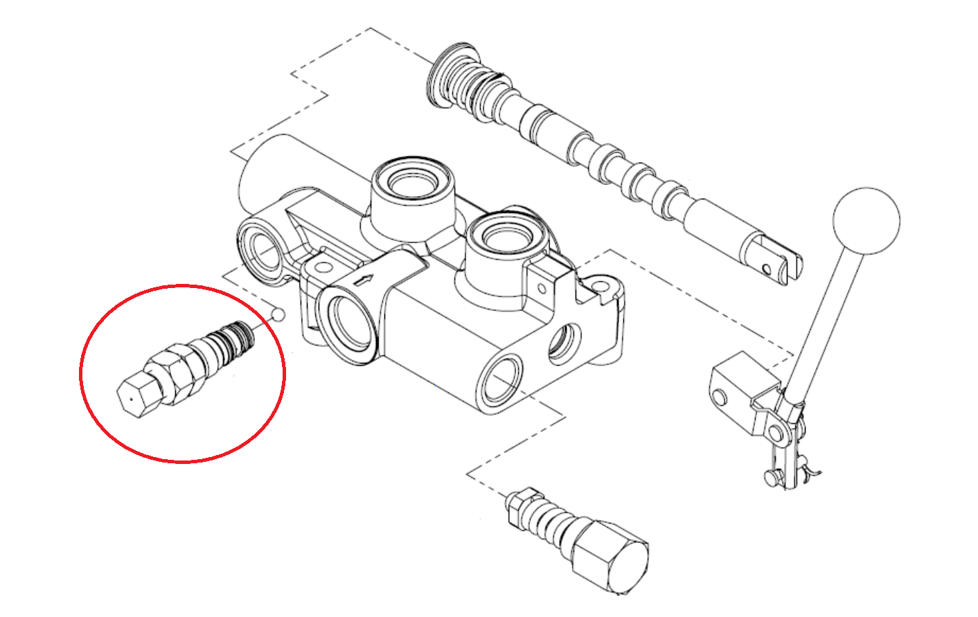 Der Druckentlastungsstift ermöglicht ein Druckentlastungssystem (automatische Rückkehr des Steuerhebels in die Mittelstellung). Wenn der Steuerkolben in das Druckentlastungssystem bewegt wird, wird das Öl zum Arbeitsanschluss „B“ umgeleitet (weg vom Hebel). Wenn der Druck am Anschluss „B“ den eingestellten Wert überschreitet, lässt der Druckentlastungsstift den Steuerhebel in die Mittelstellung zurückkehren. Die Werkseinstellung beträgt 70 bar. Der Druckentlastungsstift ist einstellbar, indem die Mutter (4) gelockert und die Einstellschraube (5) gedreht wird. Durch Drehen der Schraube im Uhrzeigersinn wird die Druckeinstellung des Druckentlastungsstifts erhöht, durch Drehen gegen den Uhrzeigersinn verringert.