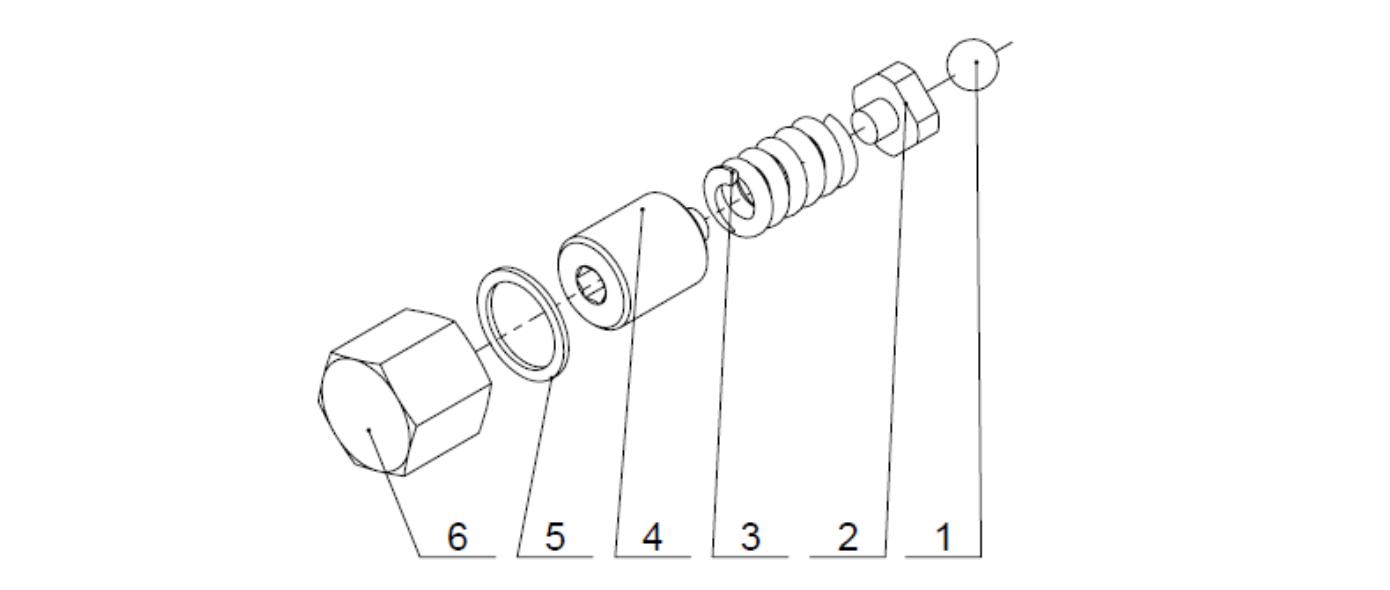 Die werkseitige Standardeinstellung beträgt 150 bar. Das einstellbare Entlastungs- (Sicherheits-) Ventil kann durch Entfernen der Mutter (6) und Drehen der Einstellschraube (4) justiert werden. Das Drehen der Schraube im Uhrzeigersinn erhöht den Druck, während das Drehen gegen den Uhrzeigersinn den Druck im Betriebssystem verringert.