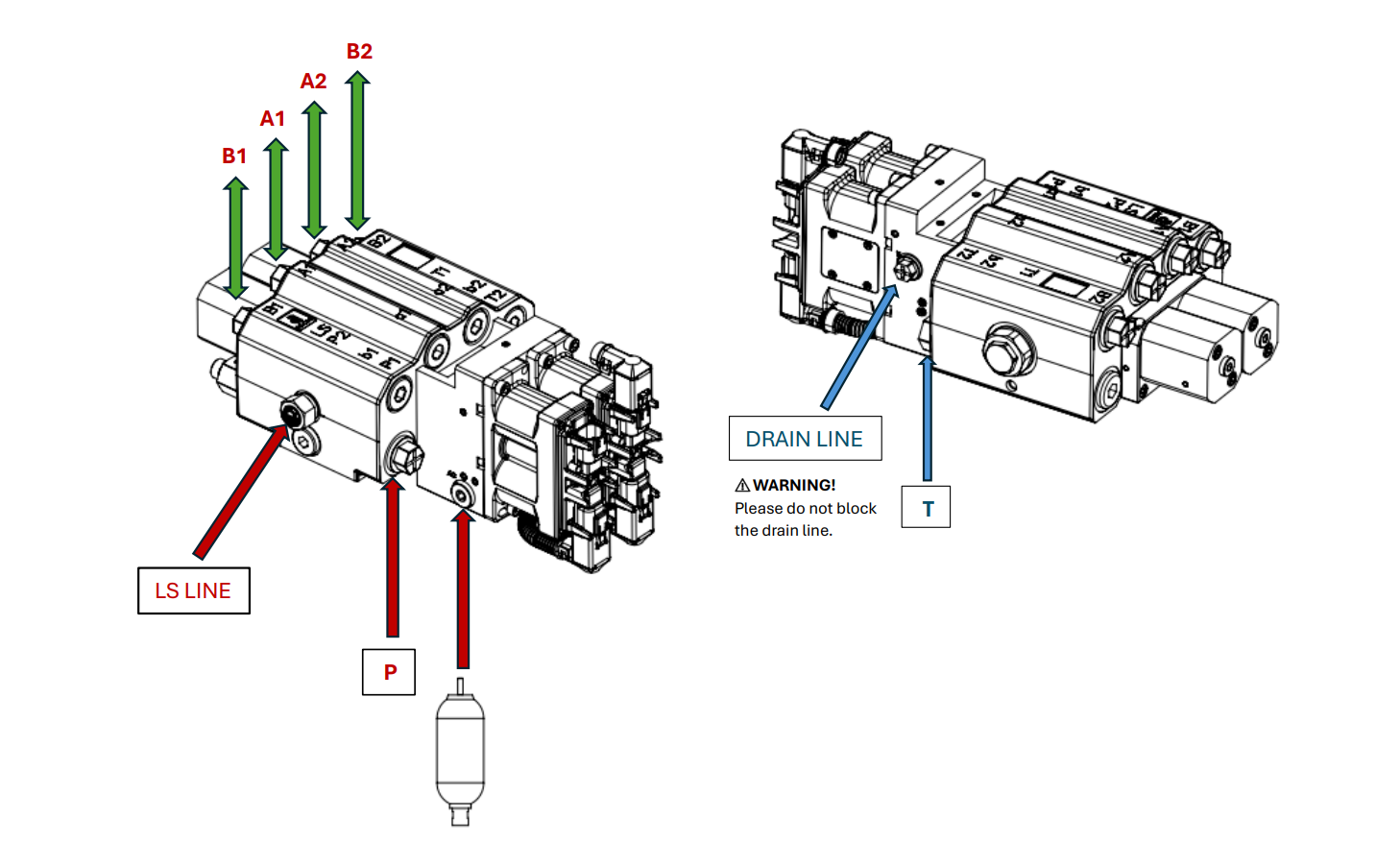 - Prüfen Sie, ob die T- (Tank) und P- (Druck) Leitungen korrekt angeschlossen und funktionsfähig sind.